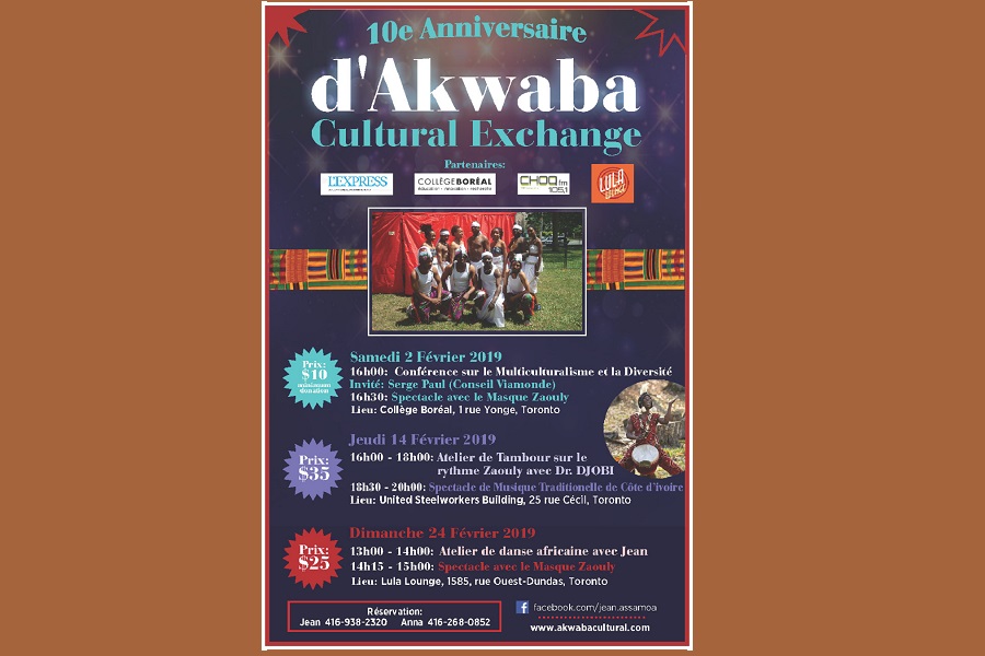 Akwaba Cultural Exchange est une organisation culturelle à but-Non- Lucratif du Grand Toronto et ses environs qui, depuis sa création officielle en 2009 se consacre aux programmes d’éducation, d’échange culturel, à l’exposition et à la mode africaine tant au niveau scolaire que dans les centres communautaires et autres. Et à cela, il faut aussi le signaler que Akwaba a conduit des ateliers, des présentations et des spectacles dans les écoles pour plus de dix milles étudiants entre Février 2009 et Mai 2018. Donc, ce bilan mérite d’être célébré avec vous, dans les écoles et la communauté francophone dans son ensemble.