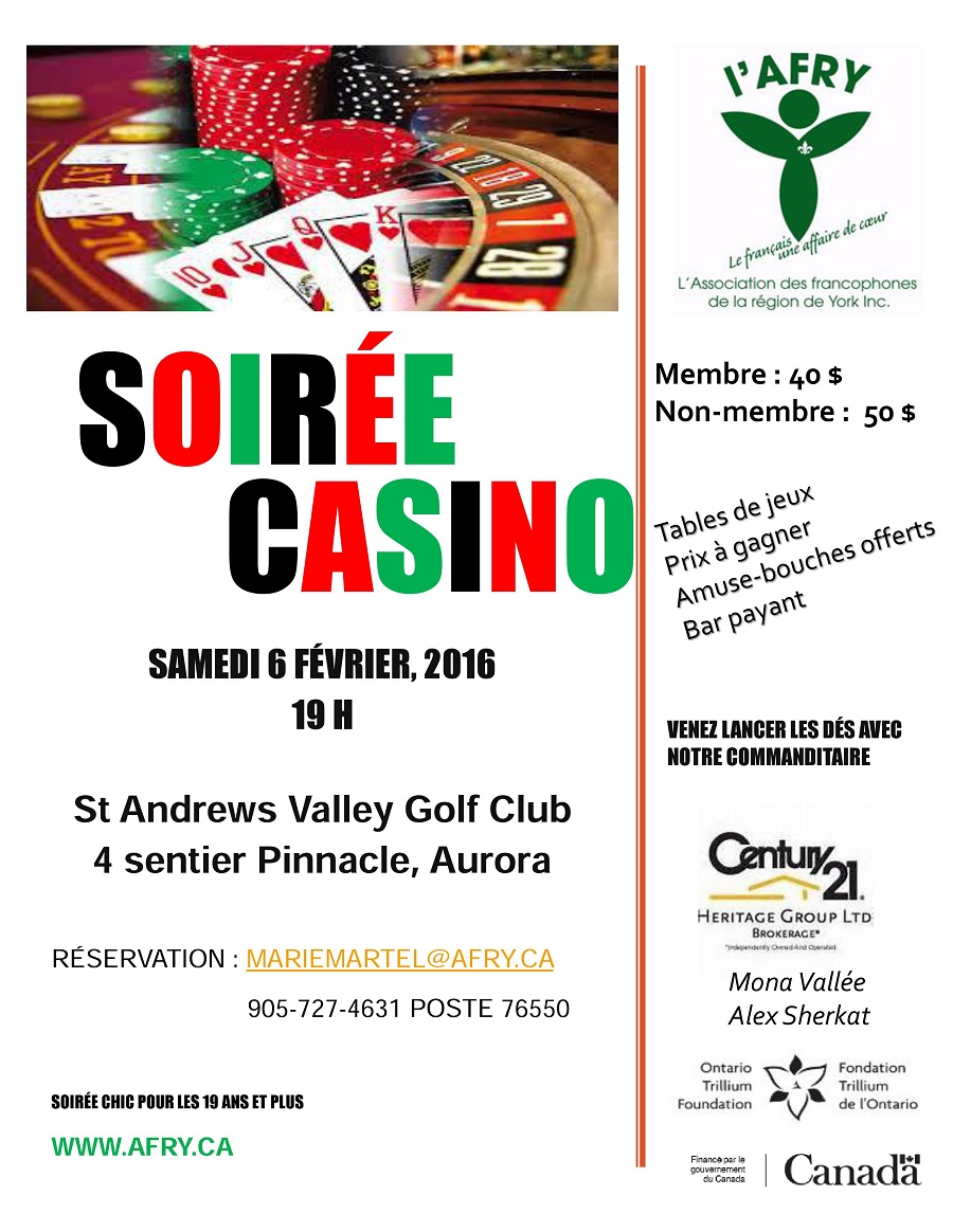 L’AFRY vous invite à vous transporter dans l’univers du CASINO le samedi 6 février à 19 h au St Andrews Valley Golf Club, à Aurora.